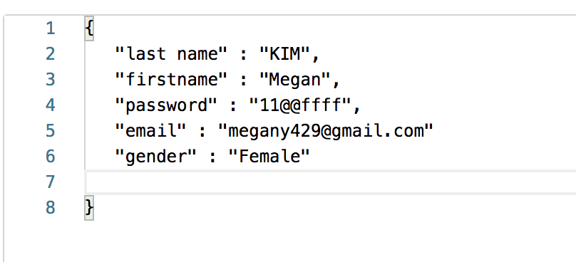 회원 추가 (POST), 즉 회원 가입 의 경우엔 상세 항목들은 RequestBody에 JSON 방식으로 아래와 같이 들어간다.