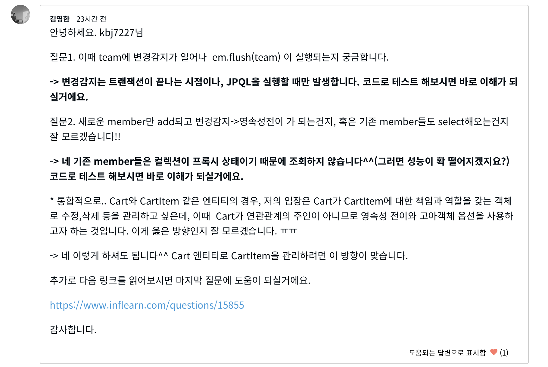 em.flush(cart); // 이 시점에 DB에 Delete 쿼리 날라감. 혹은 transaction끝날때