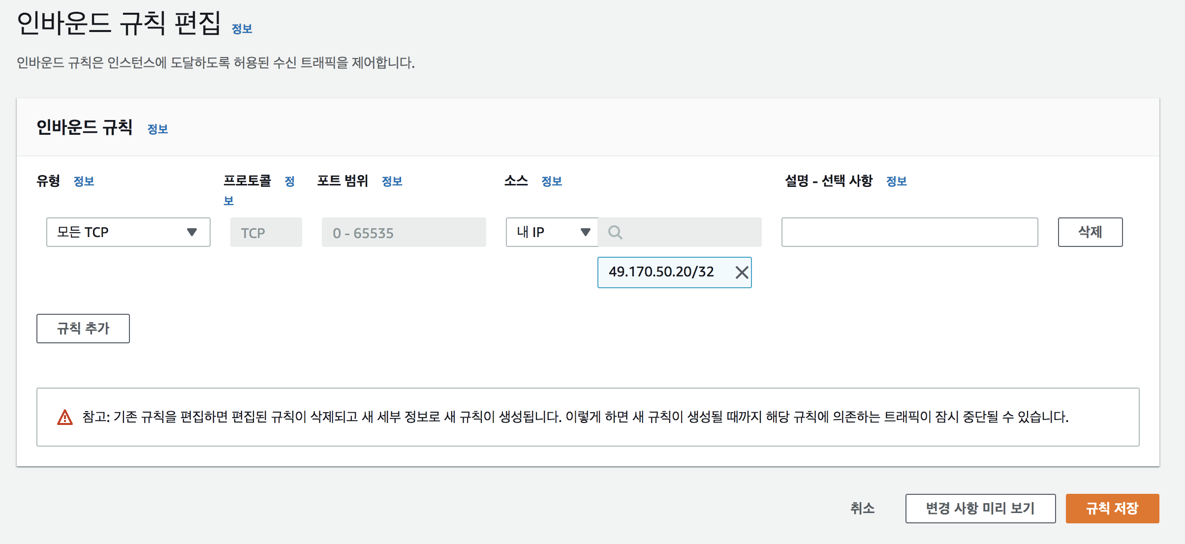 보안을 위해 허용 ip와 포트번호 범위를 추가한다. VPC 보안 그룹에서 인바운드 규칙을 설정하여 allow/deny 할 IP 등을 설정해줄 수 있다. 참고로 VPC는 Virtural Private Cloud의 약자로, EC2의 네트워킹 계층으로서 사용자가 정의하는 가상 네트워크라고 볼 수 있다.